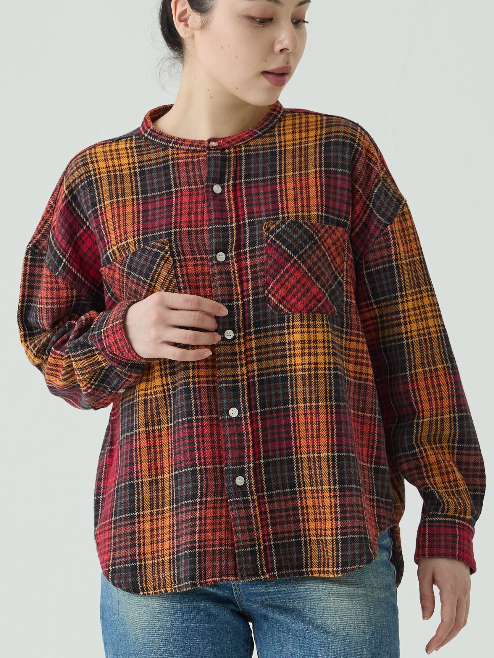 撚り杢糸で織られた柔らかネル生地を採用したスタンドカラーシャツ。